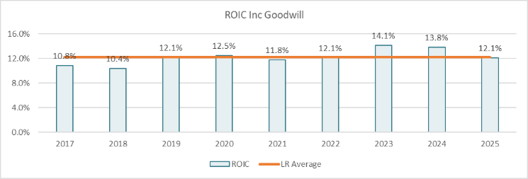 Always being mindful of both sides of the debate, one thing to be aware of is Return on Invested Capital (ROIC) a financial metric that can help assess whether a company is creating value with its investments. This is particularly relevant for serial acquirers, who might be bolting on profitability at the expense of capital efficiency. While ROE has been increasing towards the groups 13% target (leverage effect), ROIC including goodwill [1] has declined in recent years back in line with the long run average. Normalising the tax rate for FY25 brings it down further to 11%.