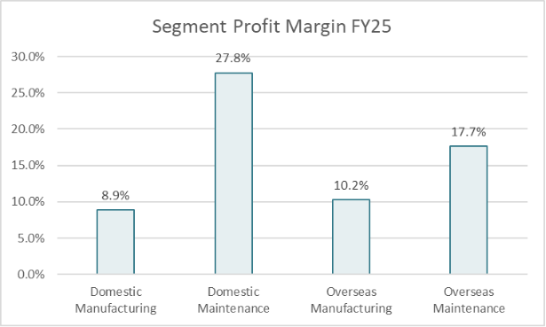 Recurring revenue: Another crucial part of Miura’s model is its maintenance contracts, which account for around 35% of sales. This is recurring, high margin work (shown below), and contract renewal rates are currently running at ~95%. The group is working on closing the gap between domestic and overseas maintenance margins (10ppts!) and are also working on an Internet of Things SaaS offering (“Steam as a Service”) to enhance remote monitoring and predictive maintenance. Yes in 2025 Steam as a Service is a thing.